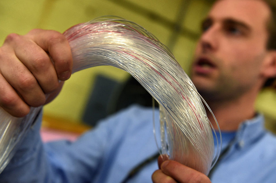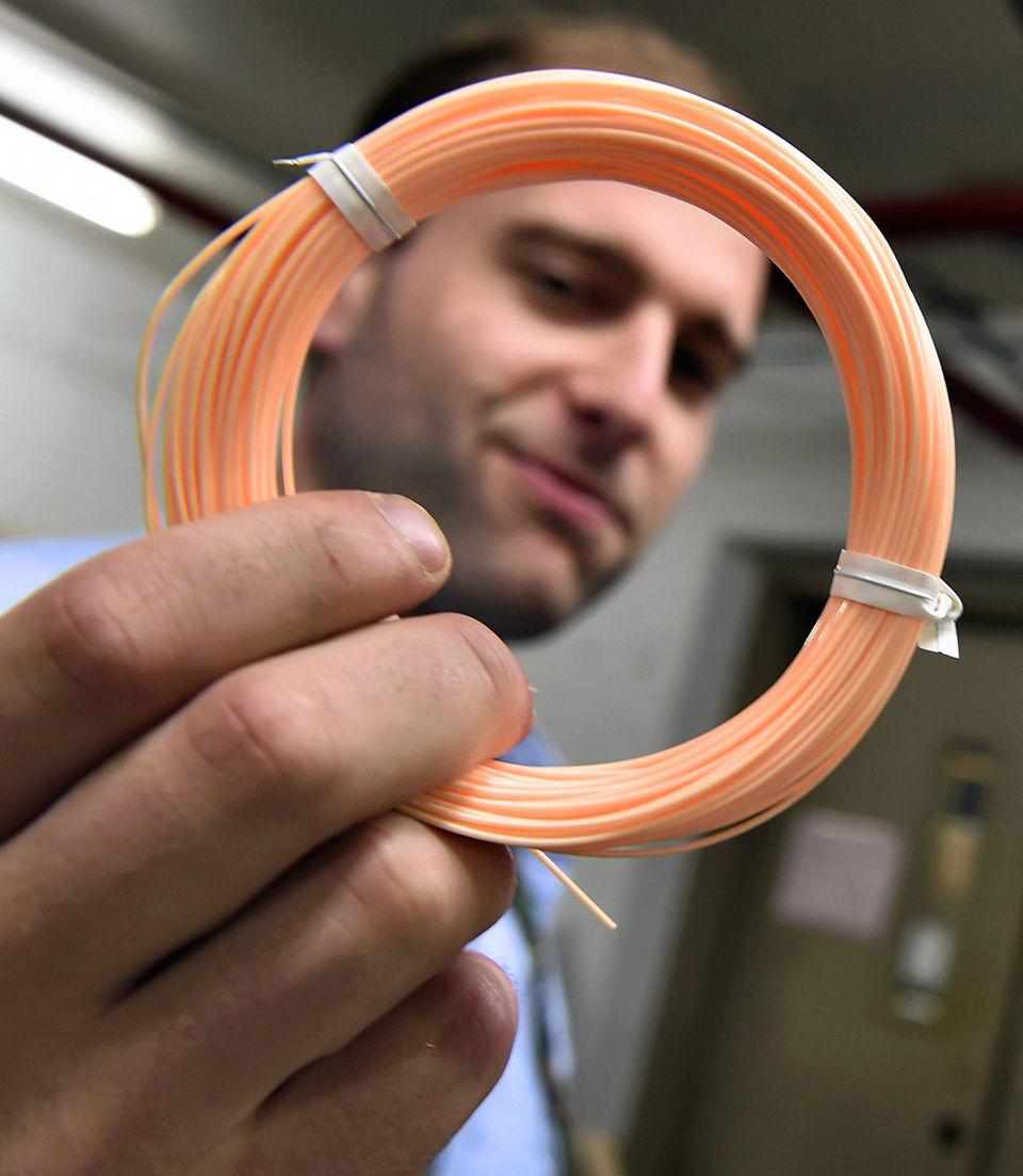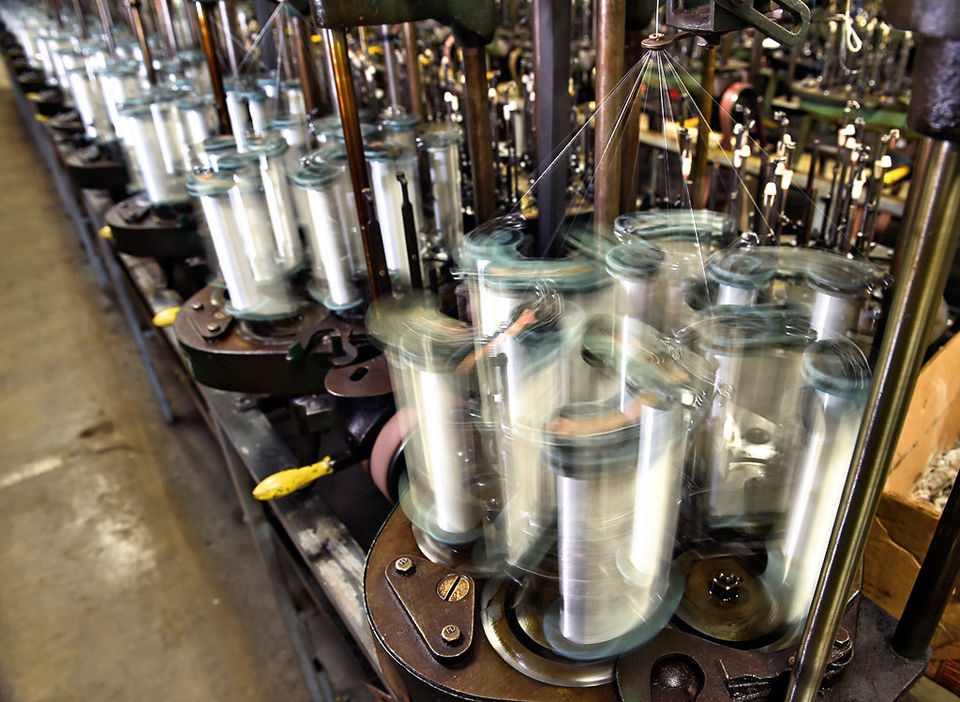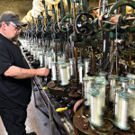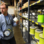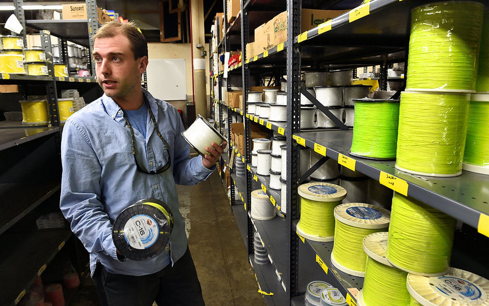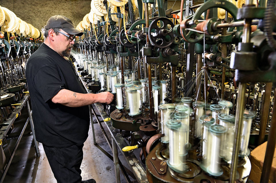 Cortland Line’s new president, John Wilson, checks out one of the company’s line braiding machines at the Cortland Factory / Submitted photo