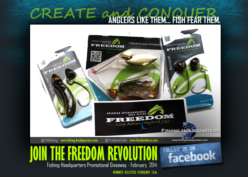 This month’s promotional gear giveaway features a chance at winning a prize package from Freedom Lures.  February’s gear package contains a Stealth Swim Jig, Rogue Football heads, and the all new Freedom Spinnerbait (a $25 value!). To enter contest, click this link: Freedom Lures Giveaway