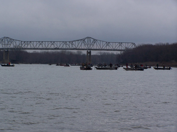 In 2007, the day before the MWC tournament, the river was muddy and rising, well on it’s way to record flood levels. The visibility in areas where I was catching fish had diminished to near zero and I could not get a bite. I finally found a creek that was pumping in clean water. I slid in there with my trolling motor, dropped my jig and plastic down, jigged it once and caught a 2.5 lb. sauger. Shortly after, my partner caught another one that was 3 pounds. We then concluded, thinking that we had found the secret spot. By the time we reached the same location t the next day, there were 30 boats in this small area and the clean water was all gone as the dirty river water backed up the creek.
