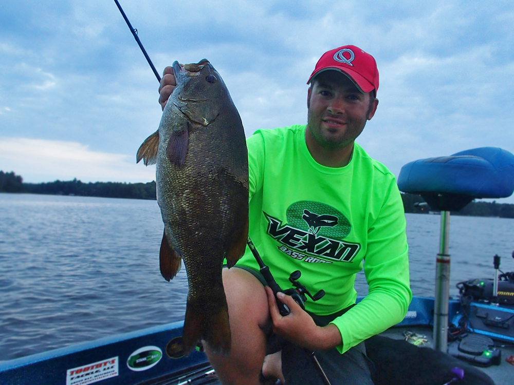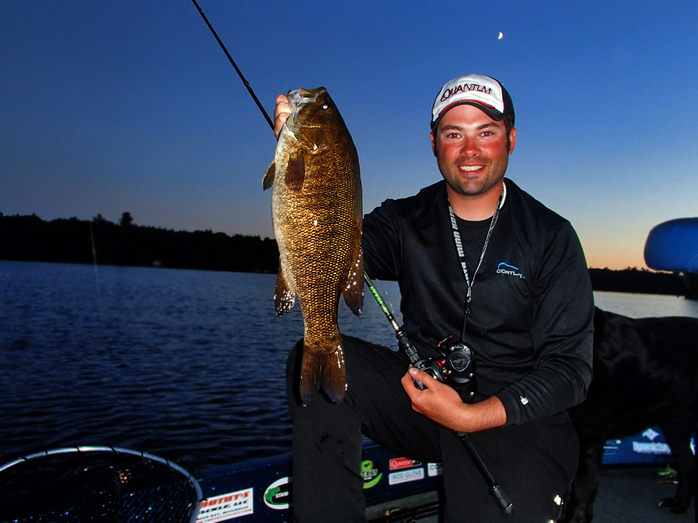 The loud Cranking Rap is an absolute favorite for night fish, which I do almost nightly during the months of July and August. I start each night on habitat-rich shorelines and main lake flats that are known crayfish and smallmouth feeding grounds. I meticulously cover these areas by power cranking, fan-casting. As my most successful nighttime smallmouth lures to date, I have found these crankbaits to possess the loudest rattles and widest, most compact vibration. Both properties are critical to triggering strikes at night. For my power cranking approach, I put the traditional flexy crankbait rod and low gear ratio reel aside and fish with 7 ft medium to medium-heavy action Vexan Rods, and Quantum Tour Edition casting rods paired with Quantum Catalyst and Tour Edition PT reels with 6.3:1 and 7.3:1 gear ratios. This power gear is spooled with 10 to 14 lb Cortland Endurance monofilament and Camouflage copolymer lines.