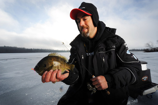 Beyond Boshold’s slick trickery and occasional sleight-of-hand, there’s a real method to his tournament fishing madness. “Lots of times,” he states, “my partner and I simply drill more holes—cover more water—than anyone else. Along these lines, we do a lot of fishing while standing up, which keeps us on the move. With the new generation of winter wear, especially my Frabill FXE SnoSuit, I can stay warm all day long, right out in the elements. I like a long rod, too, such as a 36- to 42-inch St. Croix Legend or Frabill Ice Hunter. I can keep the rodtip close to the ice to avoid freeze-up, and I can dip my jigs and pull fish out of shallow water quick, without even turning the reel handle. A long rod also lets me move to various holes all around my standing position, without doing more than shuffling my feet. Hugely efficient, especially when panfish pack into tight quarters.”